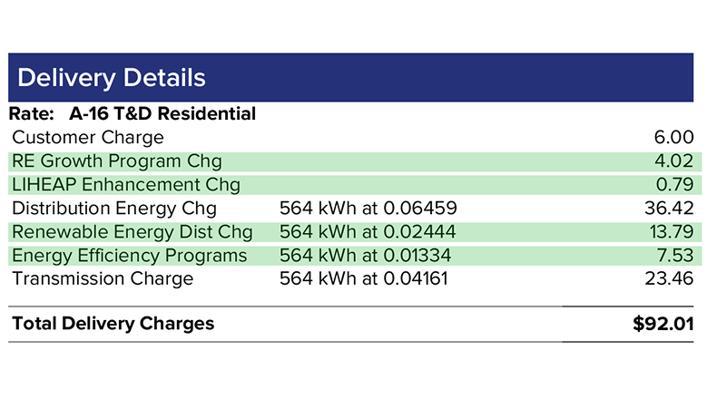- RE Growth Program Charge and the Renewable Energy Distribution Charge - Support for wind and solar energy through programs like Net Metering and long-term renewable energy contracts